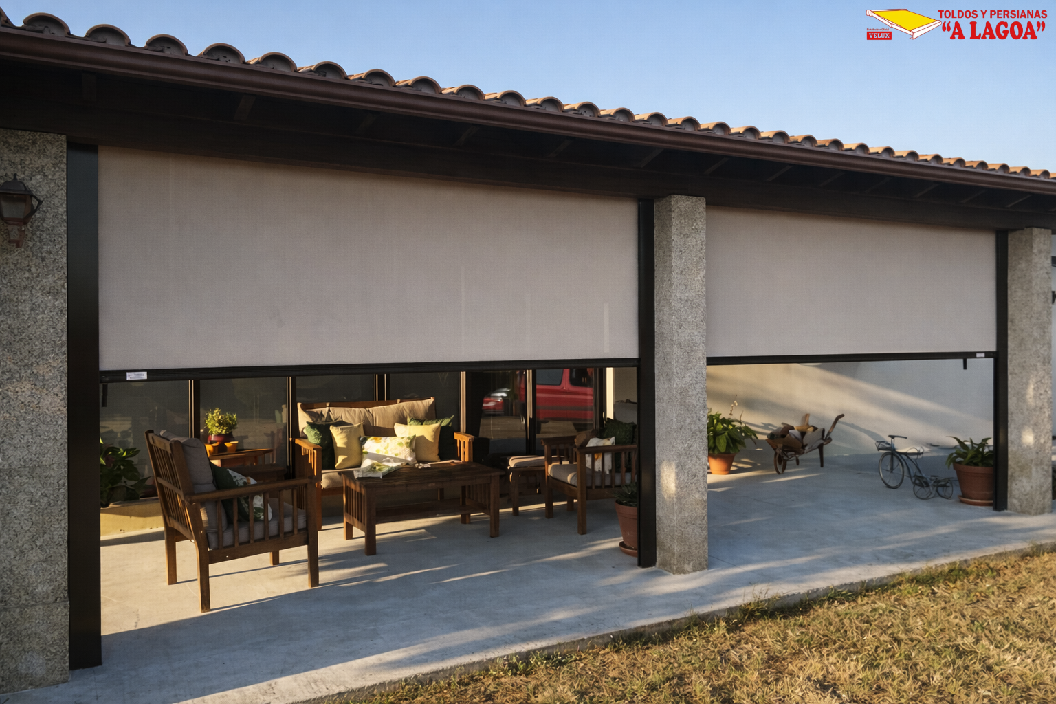 En Toldos y Persianas A Lagoa instalamos toldos verticales en Xinzo de Limia para terrazas, balcones, porches y espacios exteriores. Ofrecemos soluciones eficaces de protección solar y contra el viento, mejorando el confort y la privacidad en viviendas y negocios.